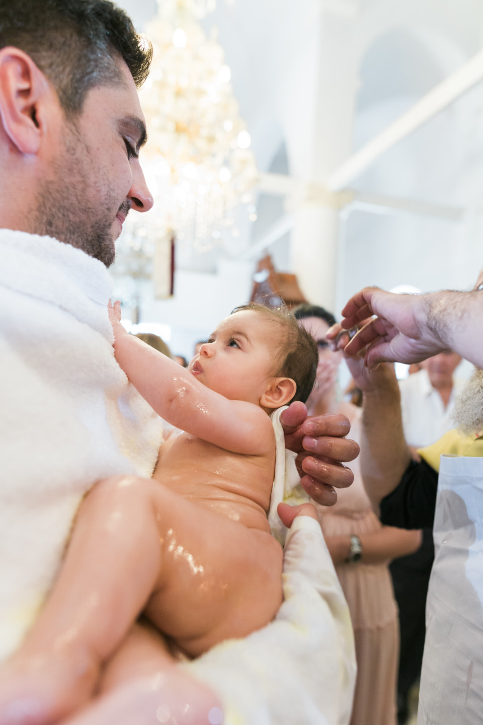 During this christening in Elafonisos, the child was relaxed and calm and looked splendid in her christening gown. It was one of these rare cases where the child really enjoys the christening ceremony and is comfortable with the attention it gets. Aggelianna was the perfect infant photography model. I had the best experience of christening photography at her baptism.