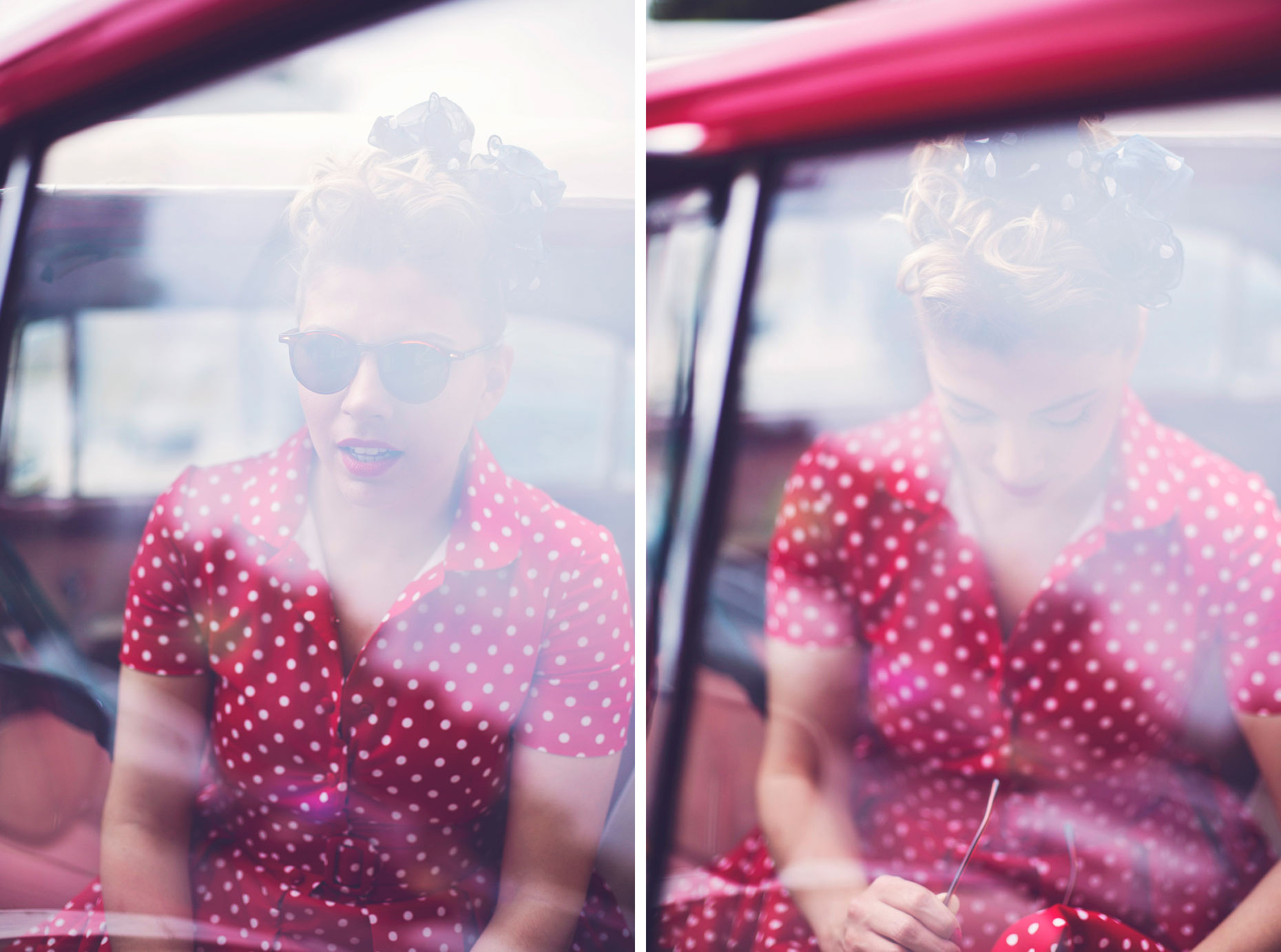 Every detail of the shoot, small and big, was inspired by the 50’s aesthetic. Colors, styling, props, gestures… everything came together to create a scene that felt like a nostalgic tribute to a time none of us lived in, yet all of us adore thanks to the magic of cinema.