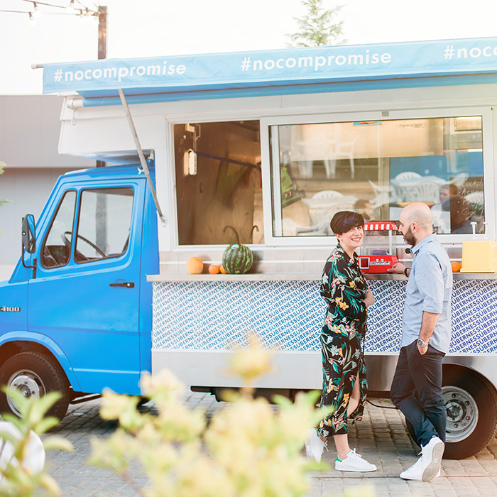 The ÜBERNESS canteen occupies three old butchers in Renti’s Market and turns them into an avant-garde canteen. Outstanding butcher elements, cement, and rusty beams make up a challenging setting. This food truck looking scenery was founded by the need of Vasilis Kallidis to create a menu inspired by the street food canteens of the National Road and his midnight cravings.