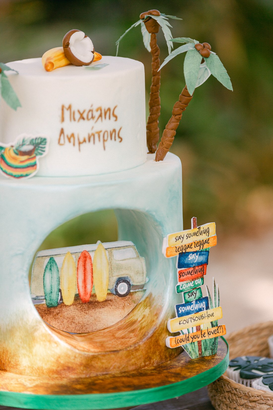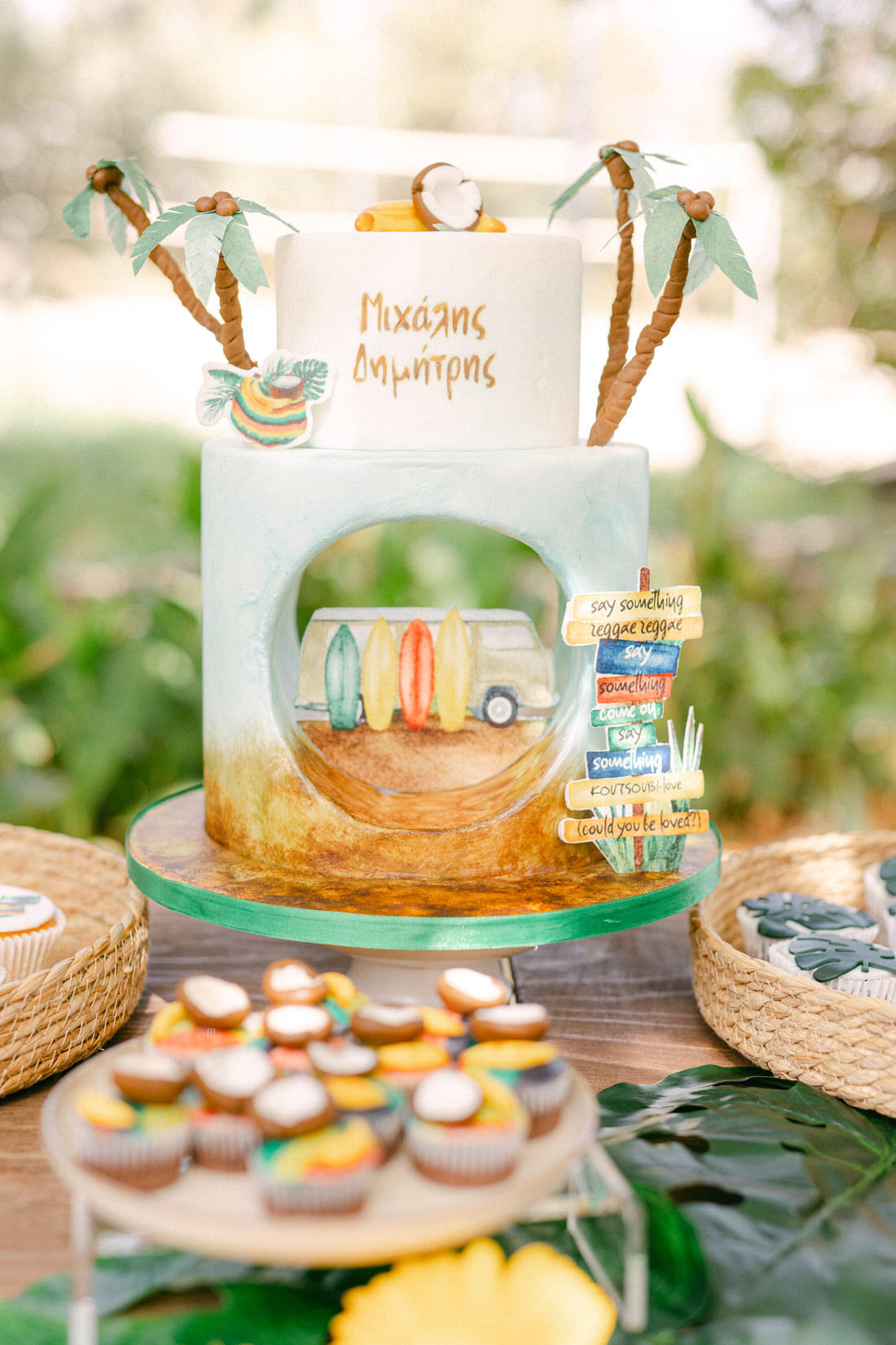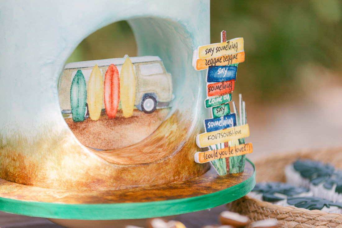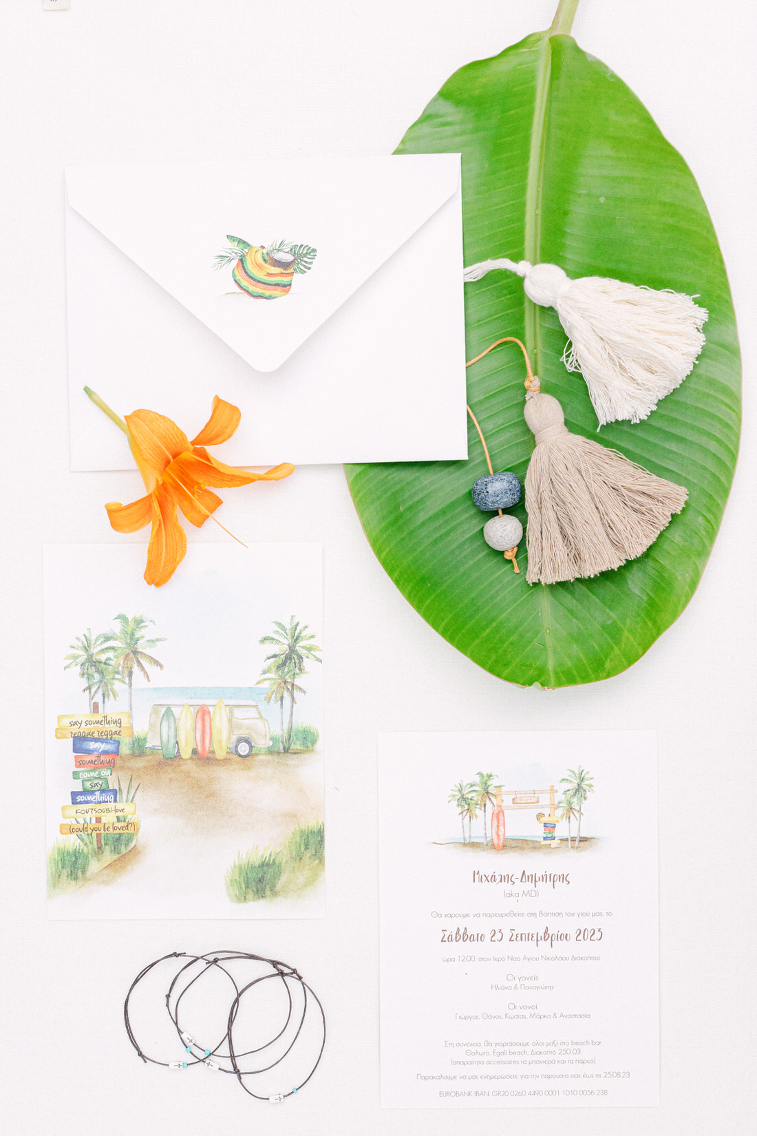 Manousenia Design gave us a custom concept inspired by Bob Marley and Jamaican colors: sunny, free-spirited, and full of personality. From the invitations to the signage, everything felt personal and fun.