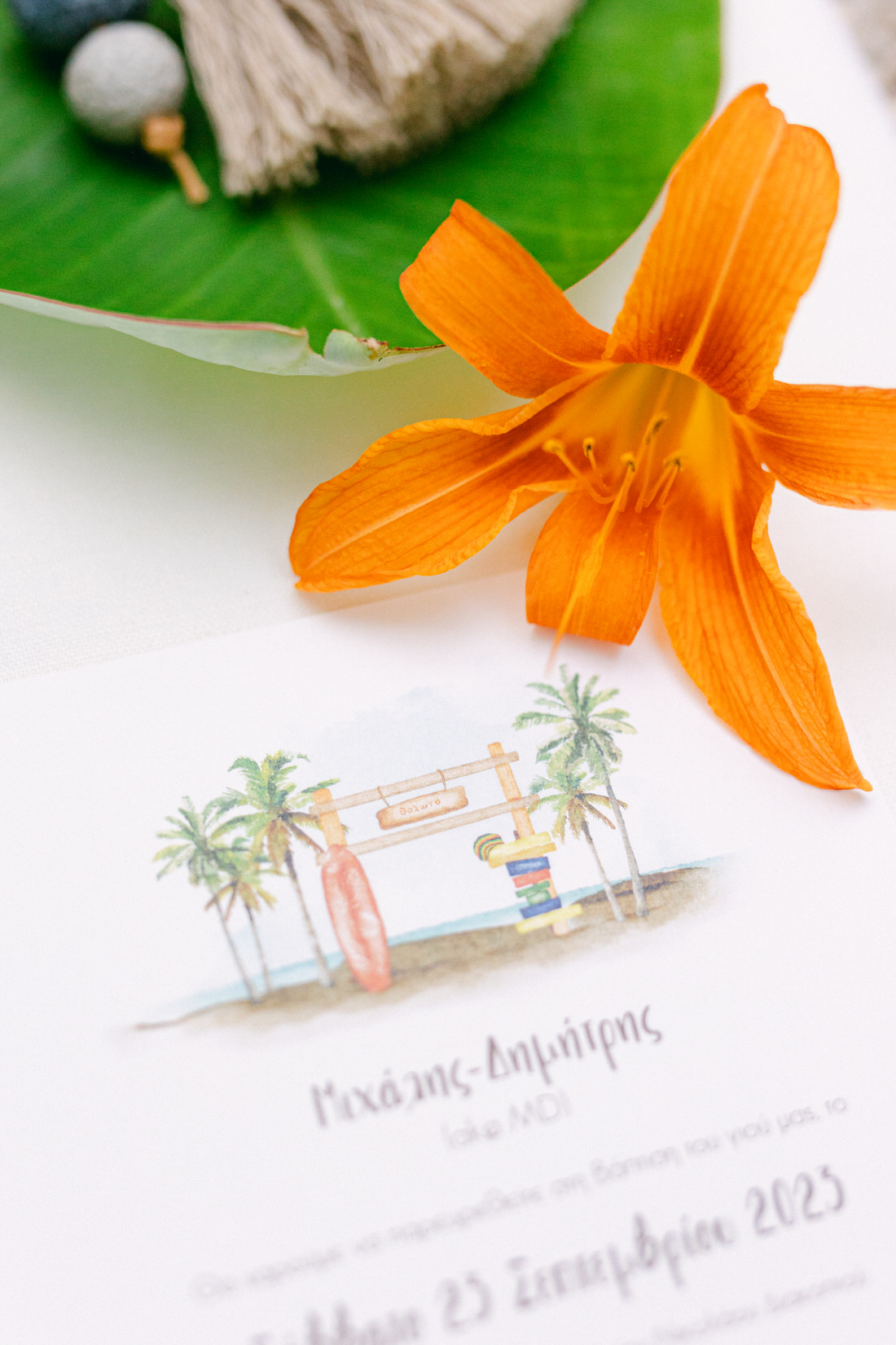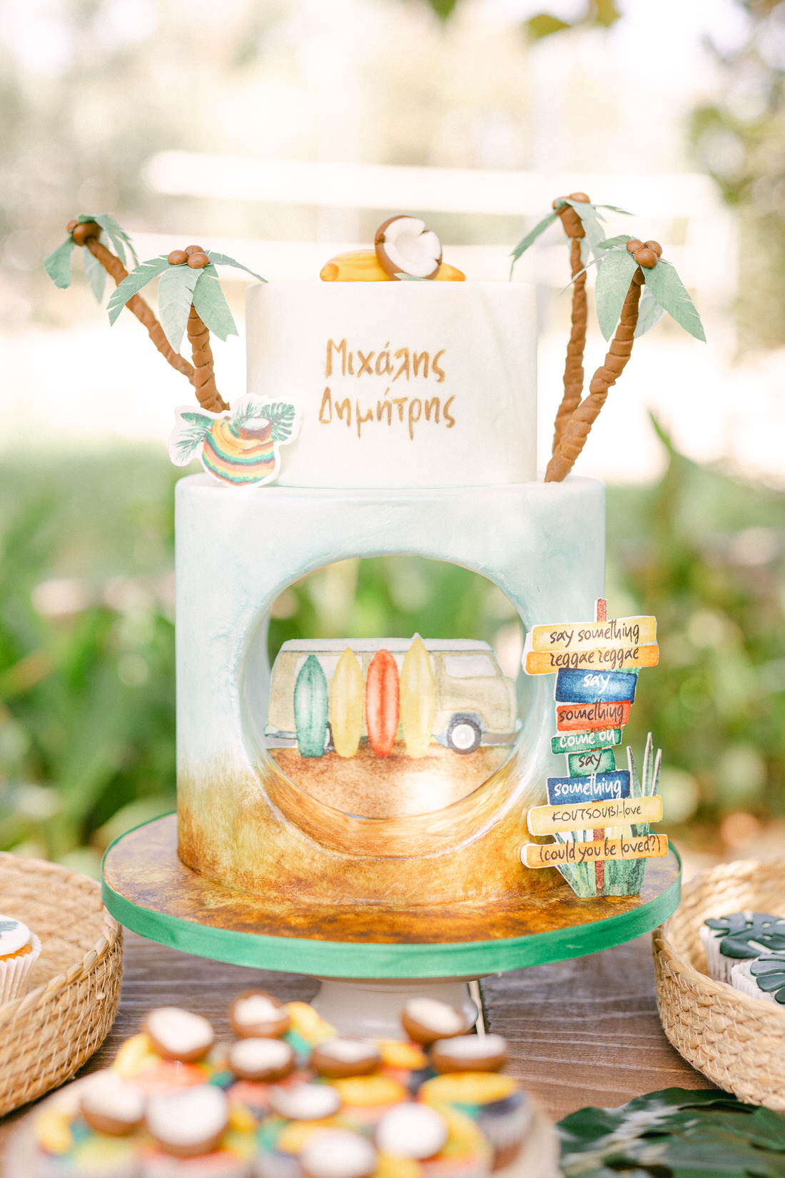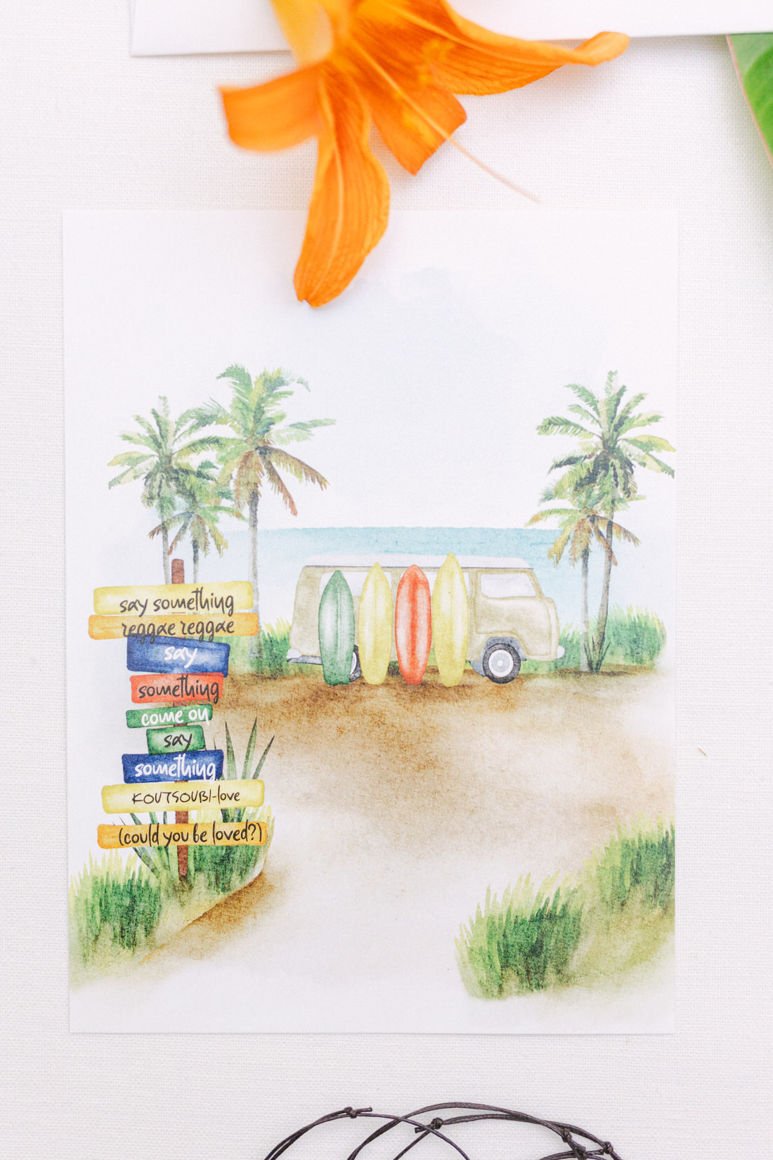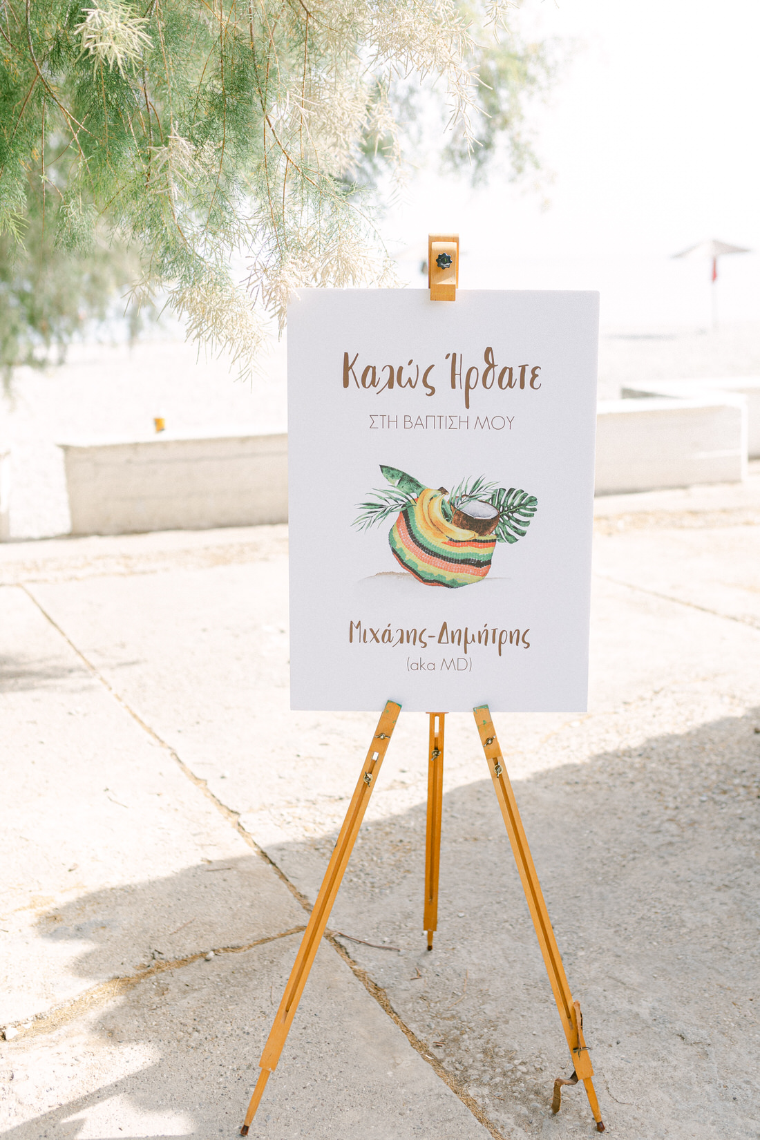 Manousenia Design gave us a custom concept inspired by Bob Marley and Jamaican colors: sunny, free-spirited, and full of personality. From the invitations to the signage, everything felt personal and fun.
