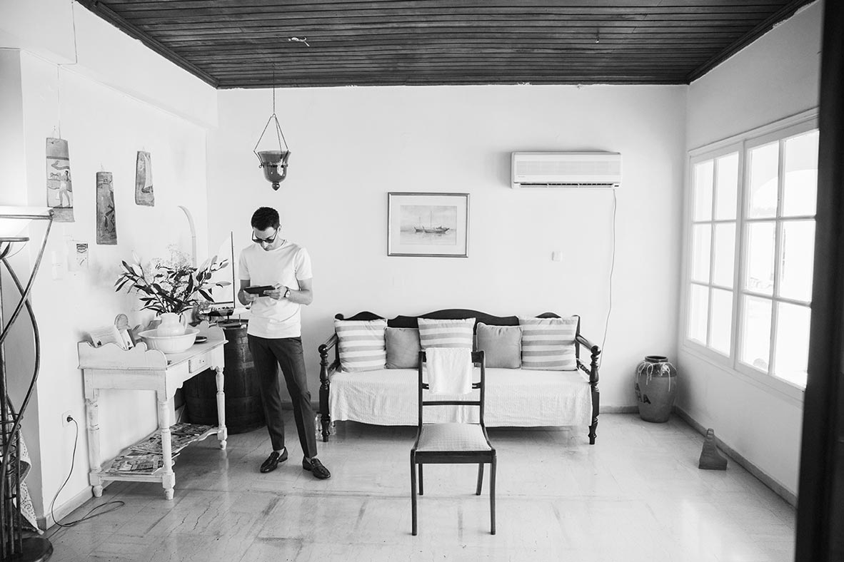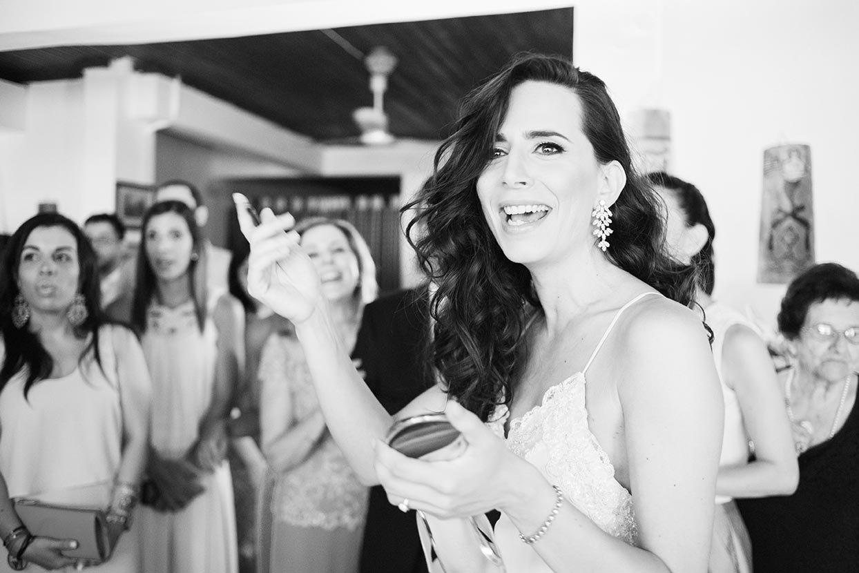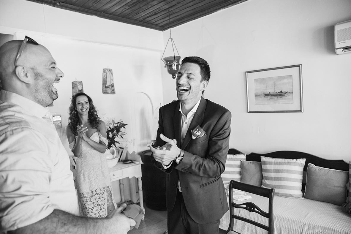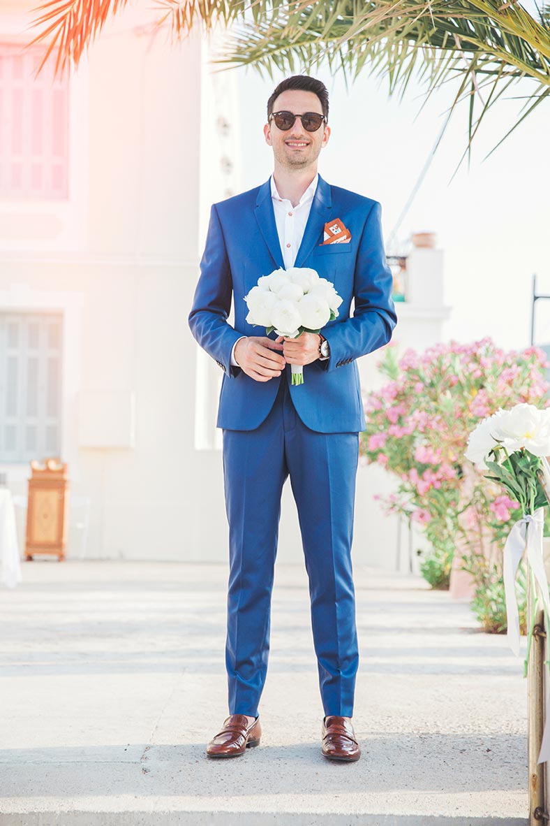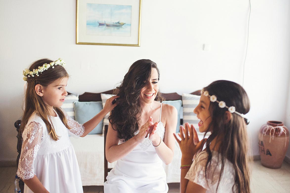 Before even arriving on the island, I had a feeling this wedding was going to be a lively celebration. Their friends had already started dancing and singing the day before the big event, the kind of energy you can’t help but love. The day began with the couple’s preparations at a beautiful Spetses complex that offered the perfect backdrop. Stephanie, elegant and calm, radiated a soft confidence. Christopher, full of excitement and attention to detail, reminded us why opposites attract and balance each other so beautifully.