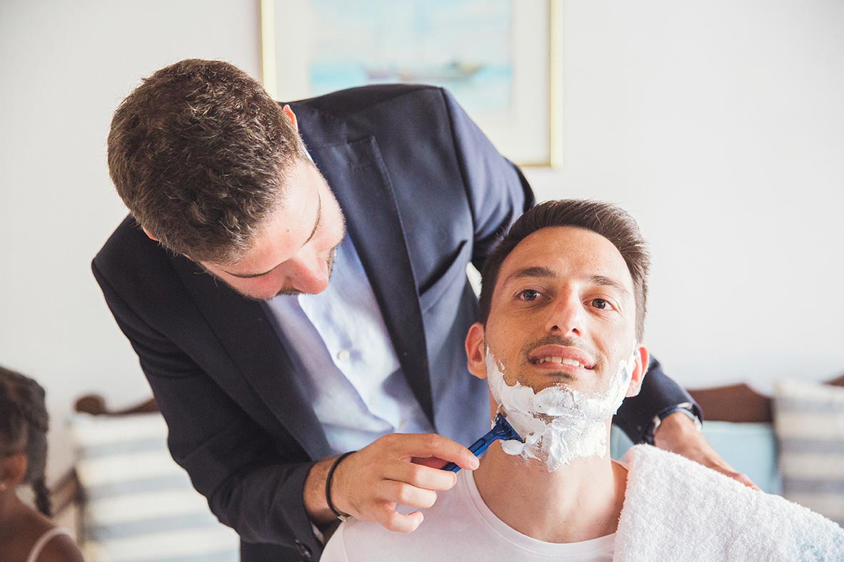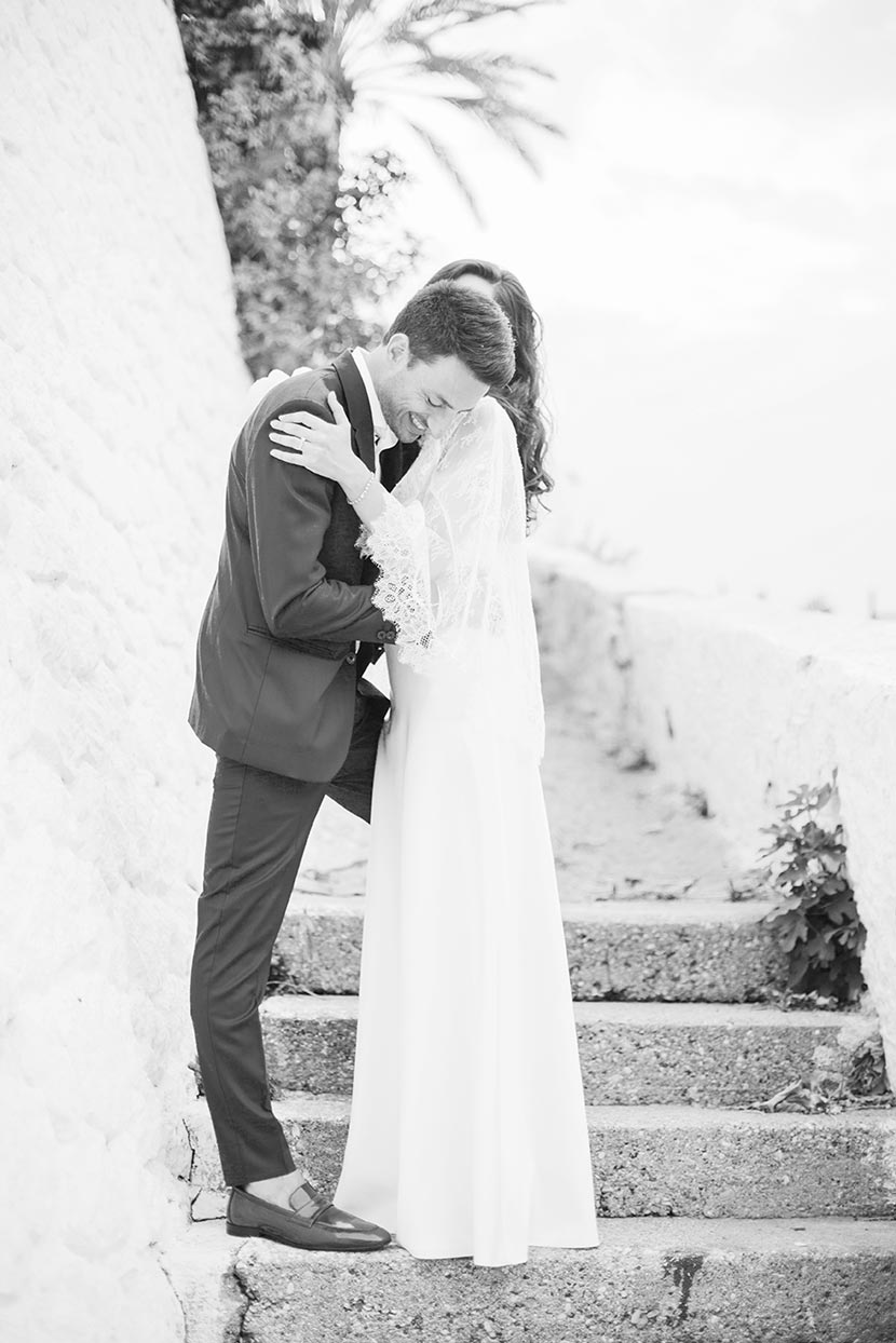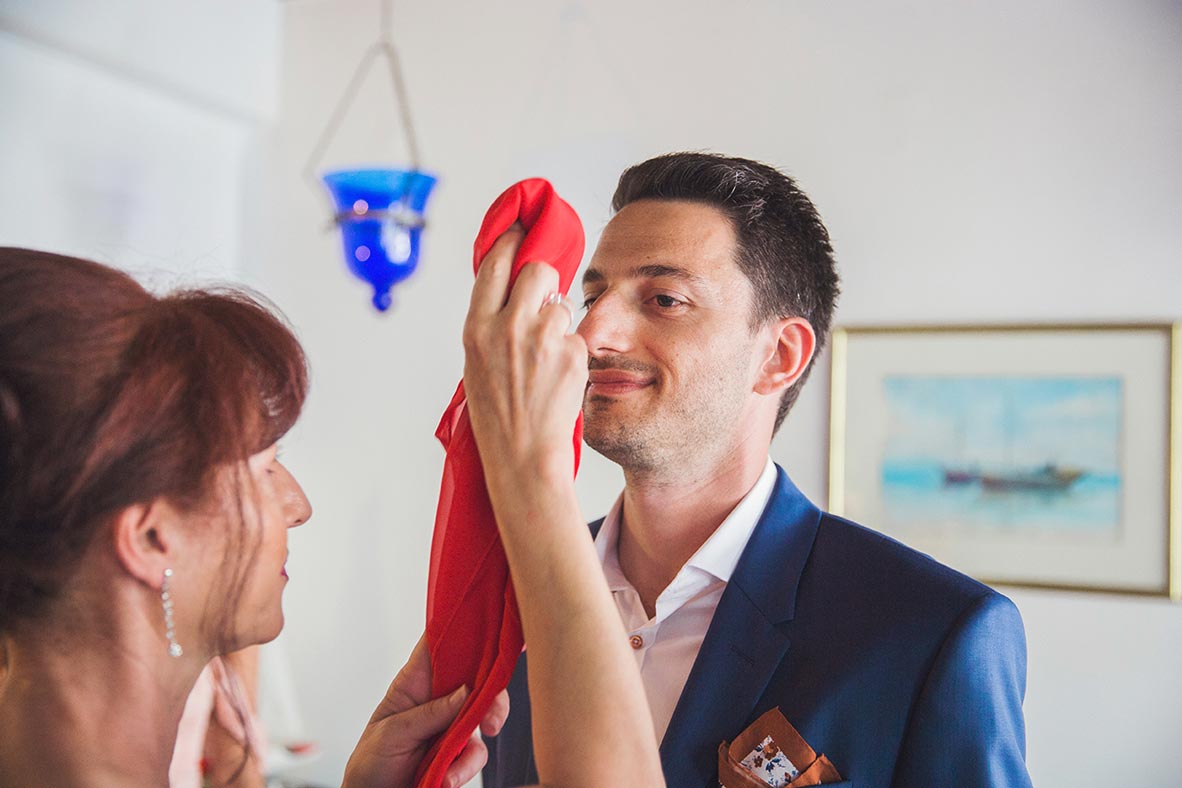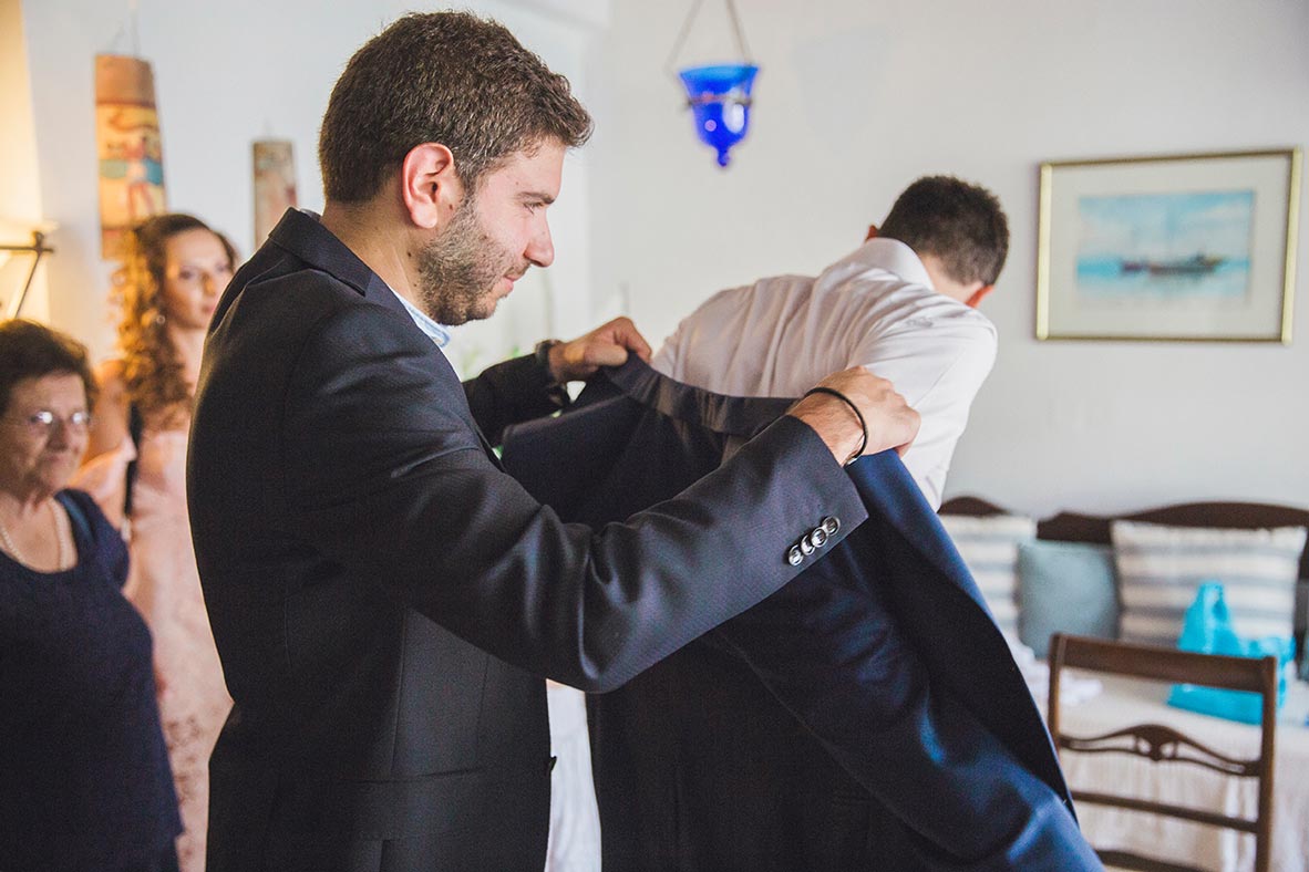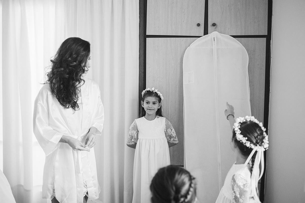 Before even arriving on the island, I had a feeling this wedding was going to be a lively celebration. Their friends had already started dancing and singing the day before the big event, the kind of energy you can’t help but love. The day began with the couple’s preparations at a beautiful Spetses complex that offered the perfect backdrop. Stephanie, elegant and calm, radiated a soft confidence. Christopher, full of excitement and attention to detail, reminded us why opposites attract and balance each other so beautifully.