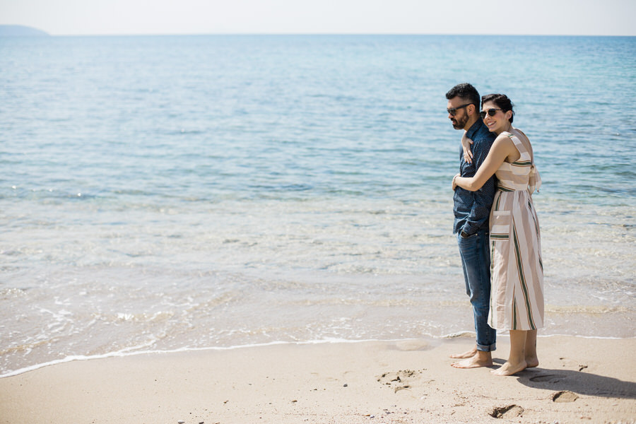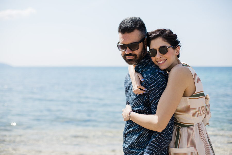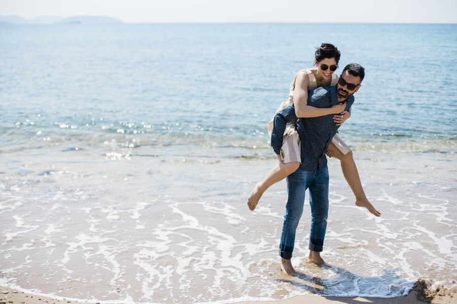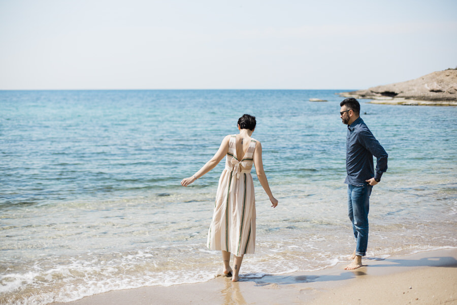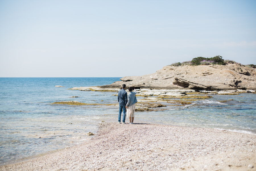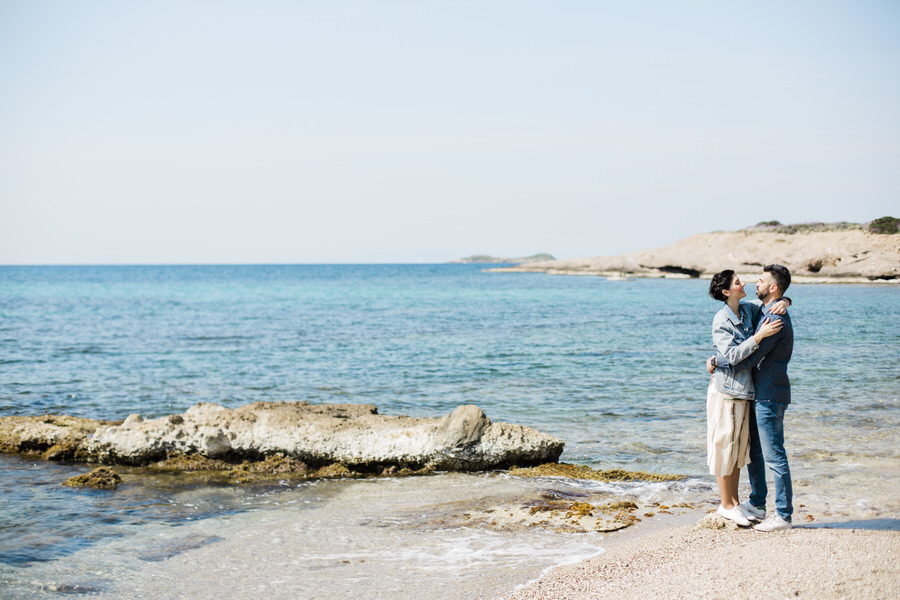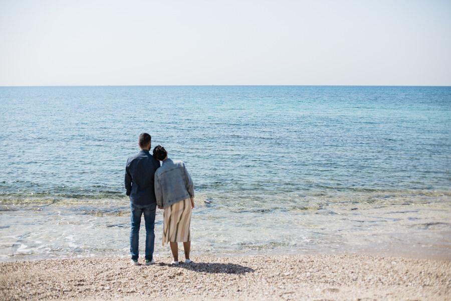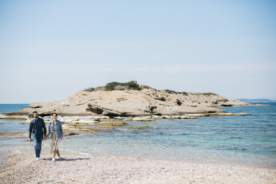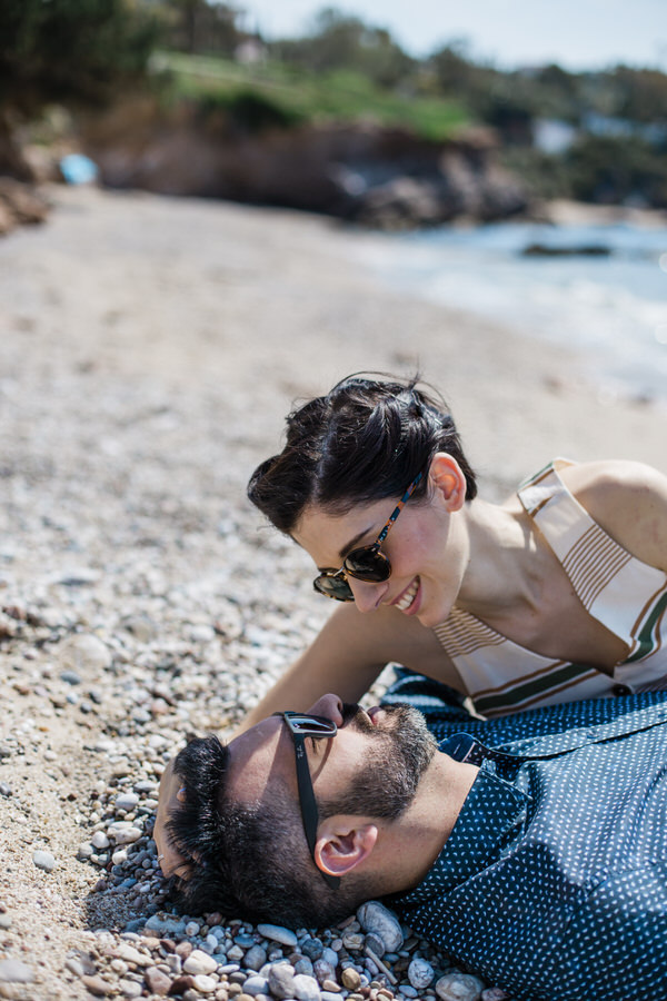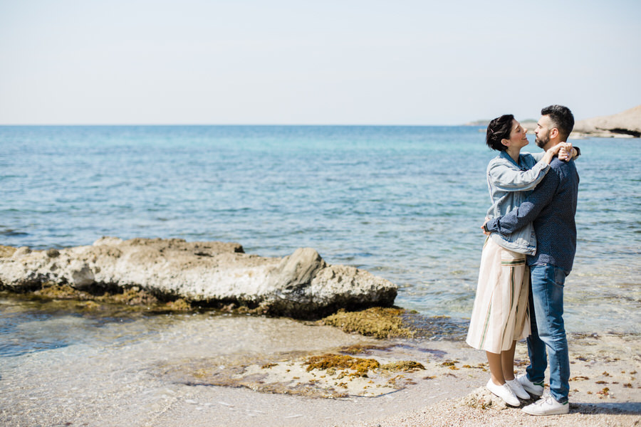 We were searching with Theodora and Vasilis a rather private beach, so we could do their pre-wedding shooting. Their wedding was about to happen in the old city of Athens, Plaka, so we thought that a pre-wedding at the beach was a nice contrast, and yet contained the Greek summery feeling.